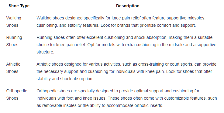 Remember, the best shoes for knee pain relief may vary depending on individual preferences and specific knee conditions. It is essential to try on different styles and brands to find the one that suits you best. Additionally, consulting with a healthcare professional or podiatrist can provide valuable insights and recommendations based on your unique needs.